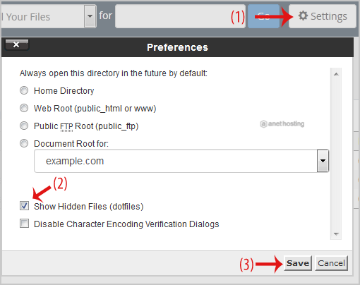 5. If the .htaccess file does not show, click on the Settings button in the File Manager. You can find the Settings button on the Right Side of the top menu. A new small window will open. Mark the Show Hidden Files (Dotfiles) option and click on the Save button. You will be able to see the .htaccess file. If it does not exist, create a new one.