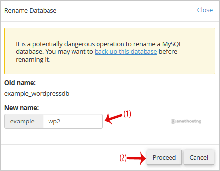 4. Change the database name and then click on the Proceed button.