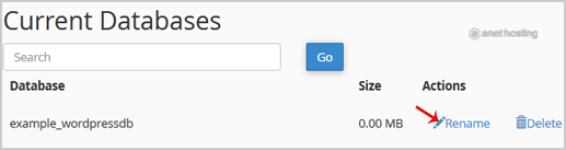 3. Under Current Databases, You can see a list of all your databases. Locate the Database and then click on Rename Icon.