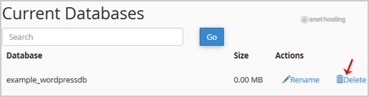 3. Under Current Databases, you can see a list of all your databases. Locate the Database you wish to remove and then click on the Delete icon.