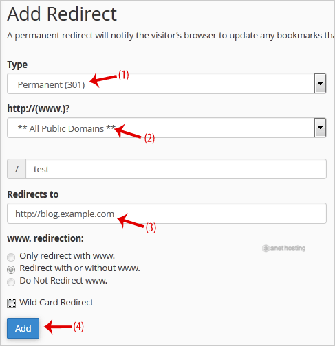3. Under Add Redirect, you should enter the following details and chose the appropriate option.
