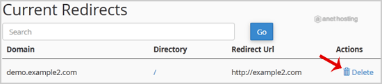 3. Scroll down to the end of the page and under Current Redirects locate the domain and click on the remove icon.