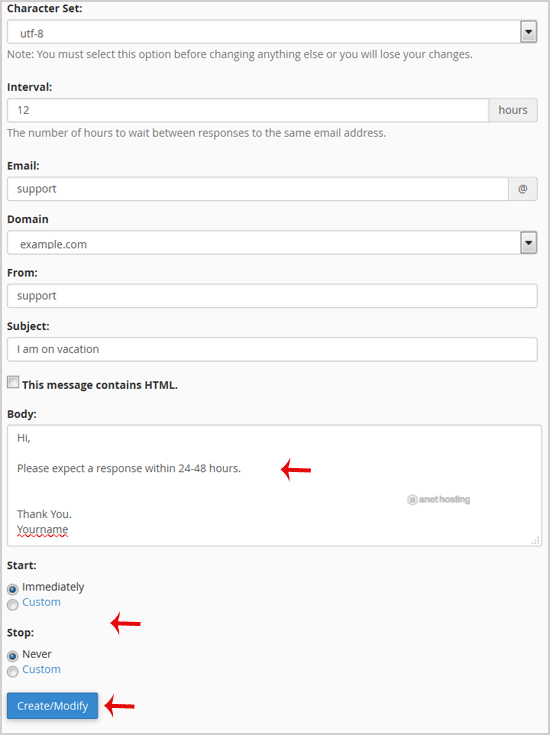 5. In the Email, field enters your email address on which you want to enable autoresponder. If you want to enable auto responder on support@example.com, enter support in the email field and should you have multiple domains, select the appropriate domain from the dropdown list.