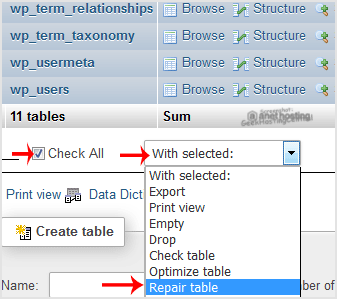 5. Scroll down and mark Check All then click on the Drop-down option and select Repair table.